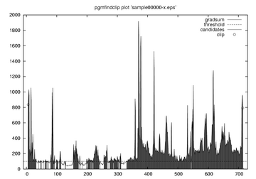 Another more visual analysis tool is enabled with the -p (for plot) option. You need an installed GNUplot for this. A gradient sum plot along the columns (x) and the rows (y) is generated and stored in EPS files. You can view this with you favorite PostScript viewer (like gv):